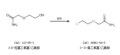 1.通过2(2-羟基乙氧基)乙酰胺合成2-(2-氯乙氧基)乙酰胺,收率约92%;