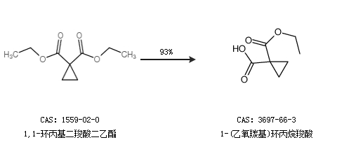 1.通过1,1-环丙基二羧酸二乙酯合成1-(乙氧羰基)环丙烷羧酸,收率约93%;