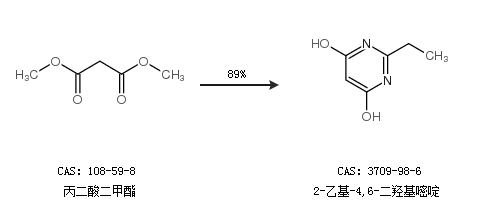 2.通过丙二酸二甲酯合成2-乙基-4,6-二羟基嘧啶,收率约89%;