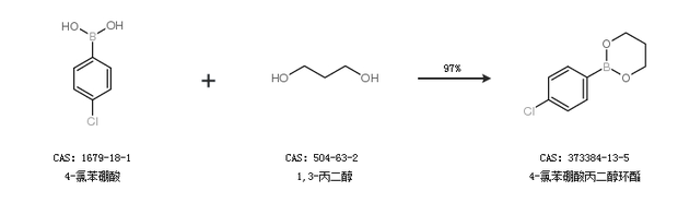 1.通过4-氯苯硼酸和1,3-丙二醇合成4-氯苯硼酸丙二醇环酯,收率约97%;