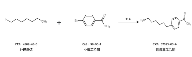 1.通过1-碘庚烷和4-溴苯乙酮合成对庚基苯乙酮,收率约71%;
