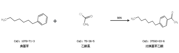 2.通过庚基苯和乙酰氯合成对庚基苯乙酮,收率约98%;
