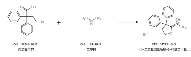 2.通过双苯溴丁酸和二甲胺合成3,3-二苯基四氢呋喃-2-亚基二甲基溴化胺