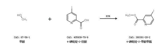 1.通过甲醇和4-碘吡啶-2-羧酸合成4-碘吡啶-2-甲酸甲酯,收率约83%;