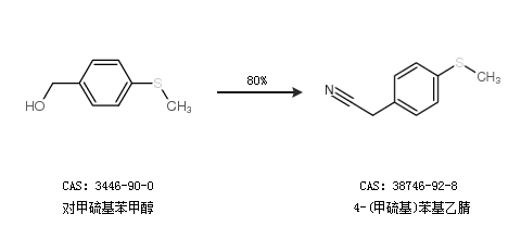 1.通过对甲硫基苯甲醇合成4-(甲硫基)苯基乙腈,收率约80%;