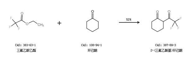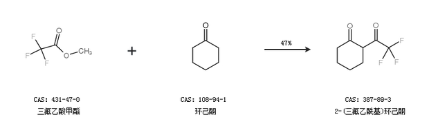 1.通过三氟乙酸甲酯和环己酮合成2-(三氟乙酰基)环己酮,收率约47%;