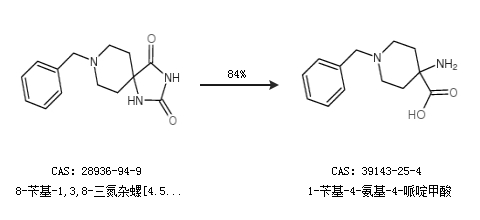 1.通过8-苄基-1,3,8-三氮杂螺[4.5]癸烷-2,4-二酮合成1-苄基-4-氨基-4-哌啶甲酸,收率约84%;