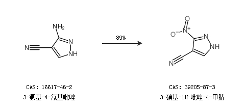 1.通过3-氨基-4-氰基吡唑合成3-硝基-1H-吡唑-4-甲腈,收率约89%;