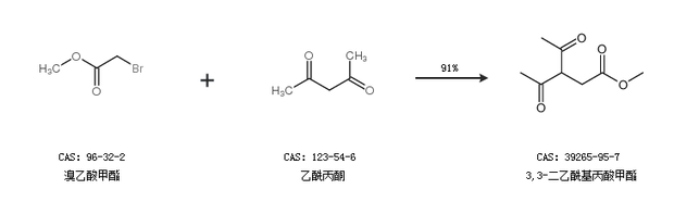 1.通过溴乙酸甲酯和乙酰丙酮合成3,3-二乙酰基丙酸甲酯,收率约91%;