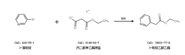 1.通过3-溴吡啶和丙二酸单乙酯钾盐合成3-吡啶乙酸乙酯,收率约86%;