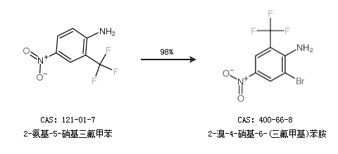1.通过2-氨基-5-硝基三氟甲苯合成2-溴-4-硝基-6-(三氟甲基)苯胺,收率约98%;