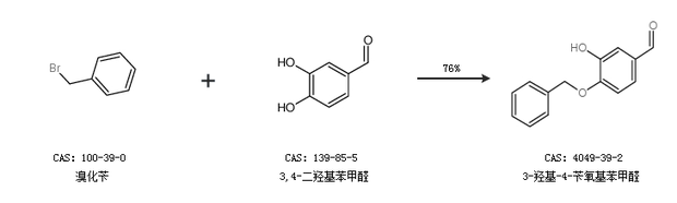 2.通过溴化苄和3,4-二羟基苯甲醛合成3-羟基-4-苄氧基苯甲醛,收率约76%;
