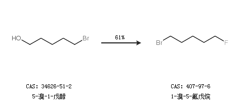 1.通过5-溴-1-戊醇合成1-溴-5-氟戊烷,收率约61%;
