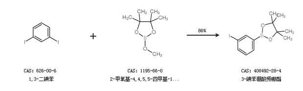 1.通过1,3-二碘苯和2-甲氧基-4,4,5,5-四甲基-1,3,2-二氧硼戊环合成3-碘苯硼酸频哪酯,收率约86%;