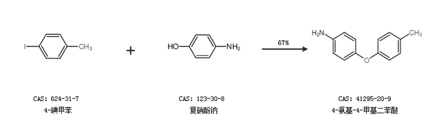 1.通过4-碘甲苯和复硝酚钠合成4-氨基-4-甲基二苯醚,收率约67%;