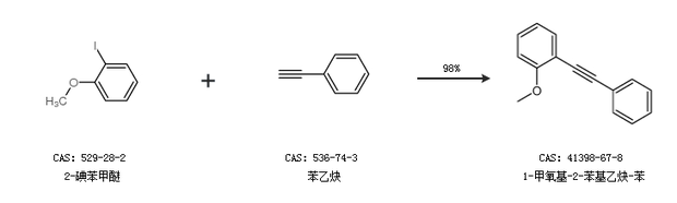 1.通过2-碘苯甲醚和苯乙炔合成1-甲氧基-2-苯基乙炔-苯,收率约98%;