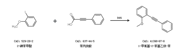 2.通过2-碘苯甲醚和苯丙炔酸合成1-甲氧基-2-苯基乙炔-苯,收率约94%;