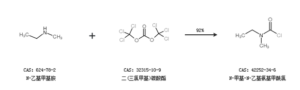 1.通过N-乙基甲基胺和二(三氯甲基)碳酸酯合成N-甲基-N-乙基氨基甲酰氯,收率约92%;