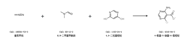 2.通过重氮甲烷、N,N-二甲基甲酰胺和4,6-二羟基嘧啶合成4-氨基-5-硝基-6-氯嘧啶