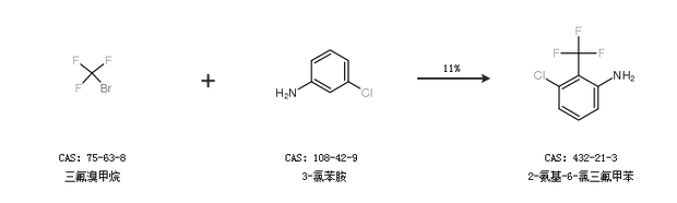 1.通过三氟溴甲烷和3-氯苯胺合成2-氨基-6-氯三氟甲苯,收率约11%;