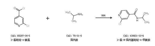 1.通过2-氯吡啶-4-酰氯和异丙胺合成2-氯-N-异丙基吡啶-4-甲酰胺,收率约99%;