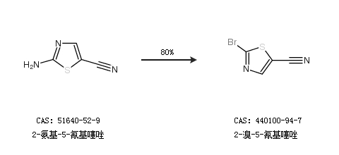 1.通过2-氨基-5-氰基噻唑合成2-溴-5-氰基噻唑,收率约80%;
