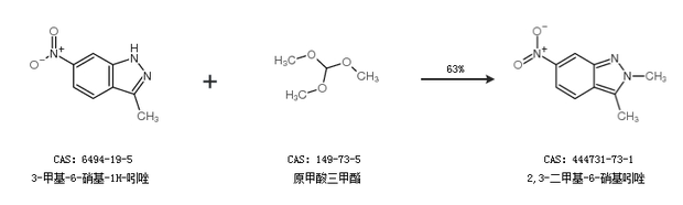 2.通过3-甲基-6-硝基-1H-吲唑和原甲酸三甲酯合成2,3-二甲基-6-硝基吲唑,收率约63%;