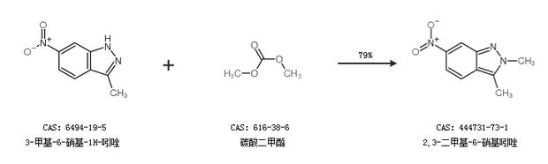 1.通过3-甲基-6-硝基-1H-吲唑和碳酸二甲酯合成2,3-二甲基-6-硝基吲唑,收率约79%;