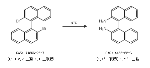 2.通过(+/-)-2,2-二溴-1,1-二联萘合成[1,1’-联萘]-2,2’-二胺,收率约47%;