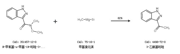 1.通过N-甲氧基-n-甲基-1H-吲唑-3-羧酰胺和甲基溴化镁合成3-乙酰基吲唑,收率约82%;