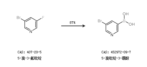 1.通过5-溴-3-氟吡啶合成5-溴吡啶-3-硼酸,收率约87%;