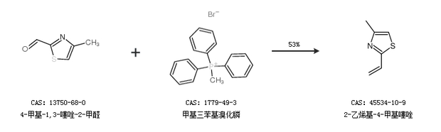 1.通过4-甲基-1,3-噻唑-2-甲醛和甲基三苯基溴化膦合成2-乙烯基-4-甲基噻唑,收率约53%;