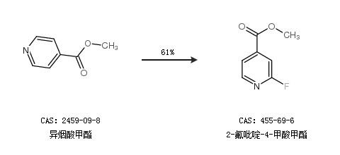 1.通过异烟酸甲酯合成2-氟吡啶-4-甲酸甲酯,收率约61%;