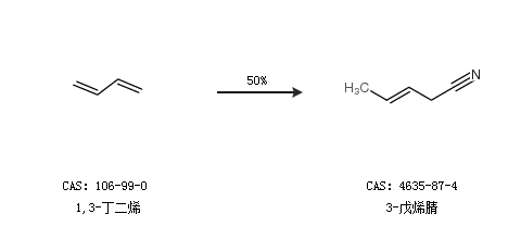 2.通过1,3-丁二烯合成3-戊烯腈,收率约50%;