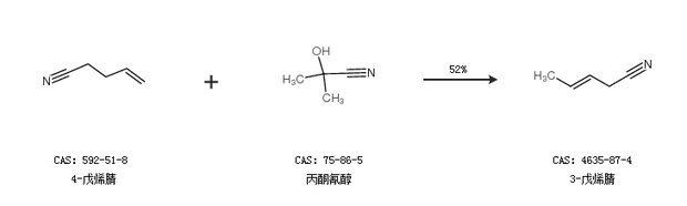 1.通过4-戊烯腈和丙酮氰醇合成3-戊烯腈,收率约52%;