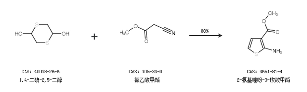 1.通过1,4-二硫-2,5-二醇和氰乙酸甲酯合成2-氨基噻吩-3-羧酸甲酯,收率约80%;