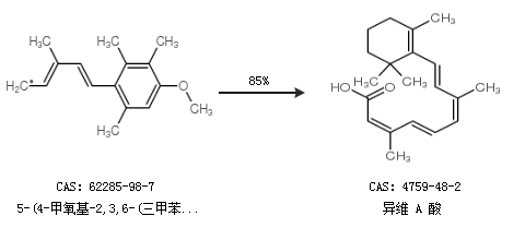 1.通过5-(4-甲氧基-2,3,6-(三甲苯基)-3-甲基-戊2,4-二烯-1-溴化三苯磷合成异维 A 酸,收率约85%;