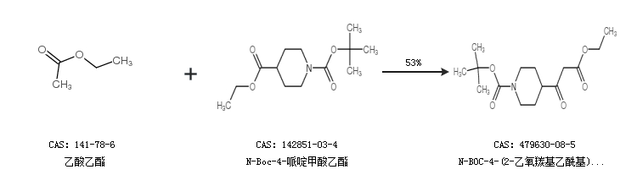 2.通过乙酸乙酯和N-Boc-4-哌啶甲酸乙酯合成N-BOC-4-(2-乙氧羰基乙酰基)哌啶,收率约53%;