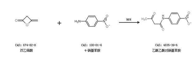 1.通过双乙烯酮和4-硝基苯胺合成乙酰乙酰对硝基苯胺,收率约96%;