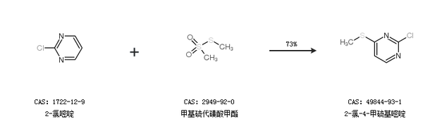 1.通过2-氯嘧啶和甲基硫代磺酸甲酯合成2-氯-4-甲硫基嘧啶,收率约73%;