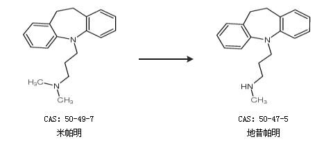 英文别名 Desipramin;Desmethylimipramine;[14C]-Desipramine;Demethylimipramine;3-(5,6-dihydrobenzo[b][1]benzazepin-11-yl)-N-methylpropan-1-amine;Dimethylimipramine;Monodemethylimipramine;Norimipramine;Desipramine;10,11-dihydro-5-[3-(methylamino)propyl]-5H-dibenz(b,f)azepin;Pertofrane;3-(10,11-Dihydro-5H-dibenzo[b,f]azepin-5-yl)-N-methylpropan-1-amine;Dezipramine;Desimipramine;[3H]-Desipramine;5-(3-methylaminopropyl)-10,11-dihydro-5H-dibenzo[b,f]azepine;