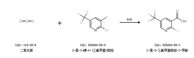 1.通过二氧化碳和2-氯-3-碘-5-(三氟甲基)吡啶合成2-氯-5-三氟甲基吡啶-3-甲酸,收率约63%;
