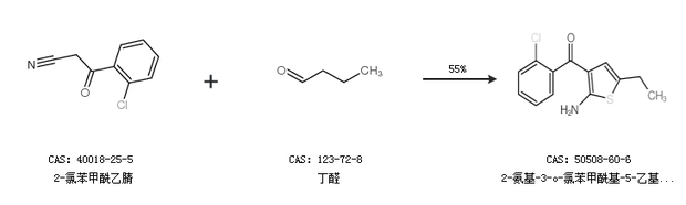 1.通过2-氯苯甲酰乙腈和丁醛合成2-氨基-3-o-氯苯甲酰基-5-乙基噻吩,收率约55%;