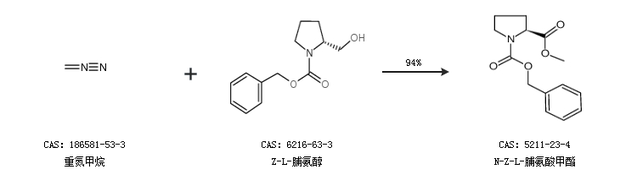 2.通过重氮甲烷和Z-L-脯氨醇合成N-Z-L-脯氨酸甲酯,收率约94%;