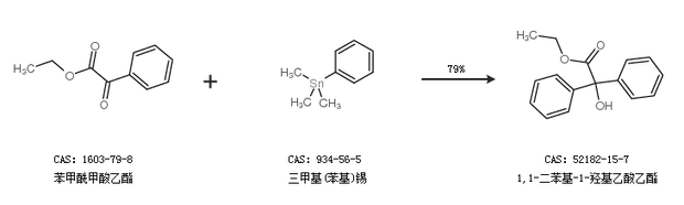 2.通过苯甲酰甲酸乙酯和三甲基(苯基)锡合成1,1-二苯基-1-羟基乙酸乙酯,收率约79%;