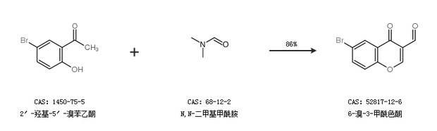 1.通过2′-羟基-5′-溴苯乙酮和N,N-二甲基甲酰胺合成6-溴-3-甲酰色酮,收率约86%;