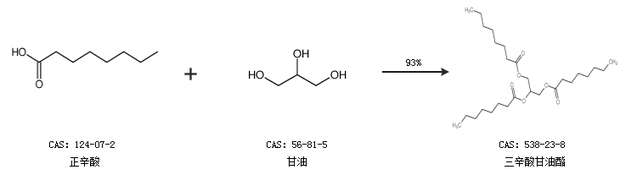 1.通过正辛酸和甘油合成三辛酸甘油酯,收率约93%;