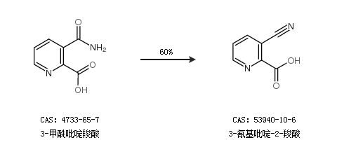 2.通过3-甲酰吡啶羧酸合成3-氰基吡啶-2-羧酸,收率约60%;