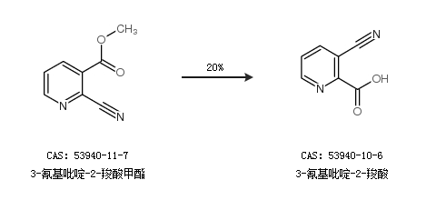 1.通过3-氰基吡啶-2-羧酸甲酯合成3-氰基吡啶-2-羧酸,收率约20%;
