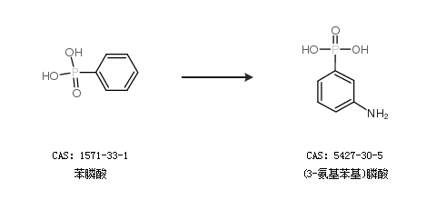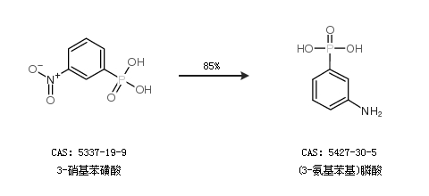 1.通过3-硝基苯磺酸合成(3-氨基苯基)膦酸,收率约85%;